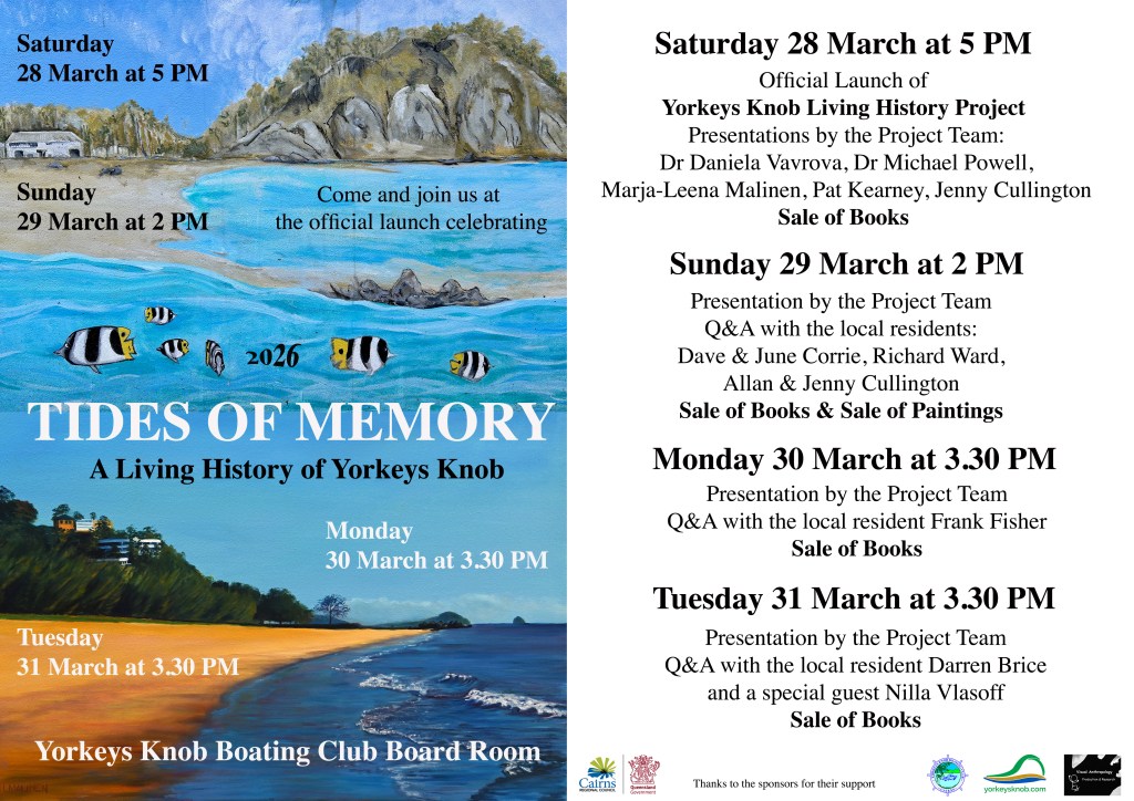 The big official launch of our local community driven Yorkeys Knob Living History Project is coming up – from 28 to 31 March 2026. Please save the dates and come along to celebrate with us! We will be updating more details about each day on weekly basis. Keep tuned to YKRA news and spread the word. There will be books and paintings on sale and lots of good time together as a community.